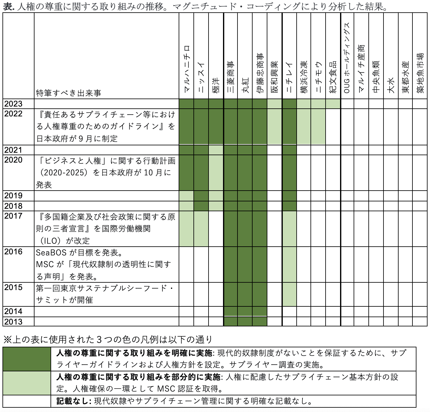 さらに、この論文では、持続可能な水産業に関わる6つの課題:(1)IUU(違法・無報告・無規制)漁業、(2) 強制労働の排除と人権の尊重、(3)生物多様性と絶滅危惧種の保護、(4)抗生物質の使用削減、(5) 海洋プラスチック対策、(6) 気候変動対策に基づいて、各企業の取り組みを分析しました。