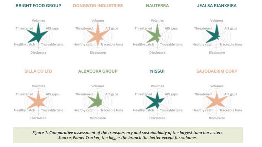 It is not just about sustainability though. Prior to our report, any investor keen to understand market share data or analyse volume growth for harvesters of tuna would have struggled. Indeed, amongst the thirty world’s largest tuna companies, despite collectively harvesting 46% of global tuna in our estimates, we found that only four companies publicly disclose catch data. This lack of transparency means external observers cannot compute simple metrics such as market share or volume growth, but also directly impacts due diligence. Without comprehensive catch data and supply chain transparency, investors cannot accurately assess the environmental and financial risks that are embedded in tuna-dependent portfolios.